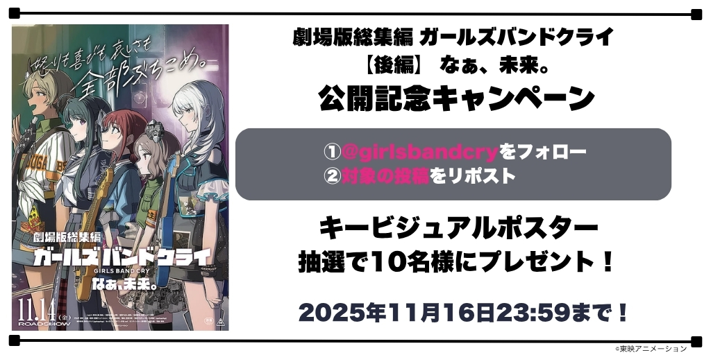 📅期限:2025年11月16日(日) 23:59 まで… pic.twitter.com/Aiut70nxMC— アニメ『ガールズバンドクライ』公式 (@girlsbandcry) November 7, 2025