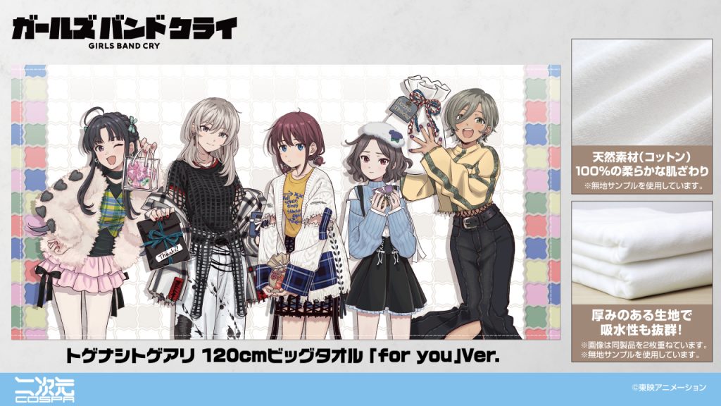 二次元コスパより、プレゼント交換を楽しむ仁菜たちトゲナシトゲアリメンバーの姿をデザインした新グッズ、「トゲナシトゲアリ 120cmビッグタオル 「for you」Ver.」が登場です!