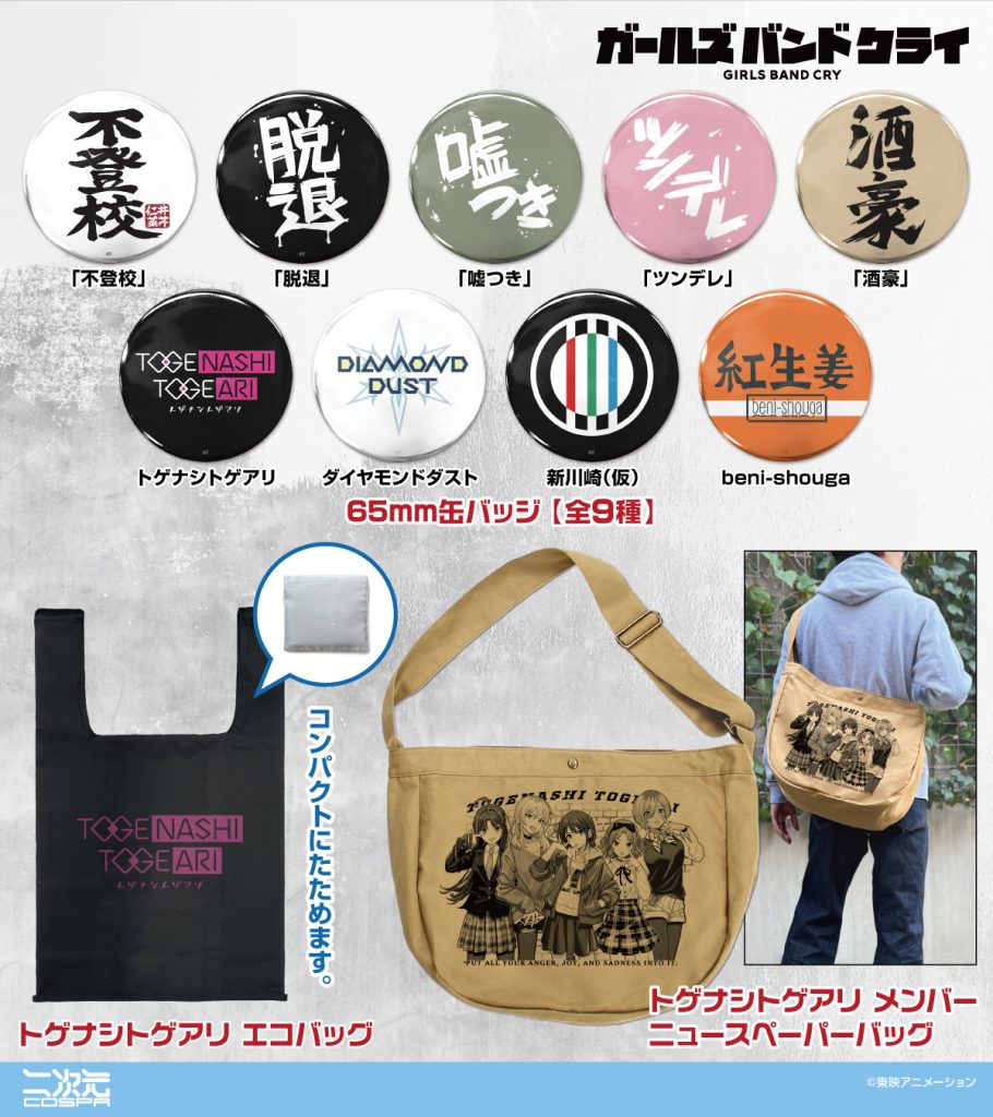 二次元コスパより、作画監督 酒井香澄描き下ろしイラストを使用した仁菜たちの「フルカラーTシャツ 爆ぜて咲くVer.」や、トゲナシトゲアリやダイヤモンドダスト、「不登校」「脱退」「嘘つき」「ツンデレ」「酒豪」などそれぞれの「65mm缶バッジ」をはじめ、多数の新グッズが登場です。